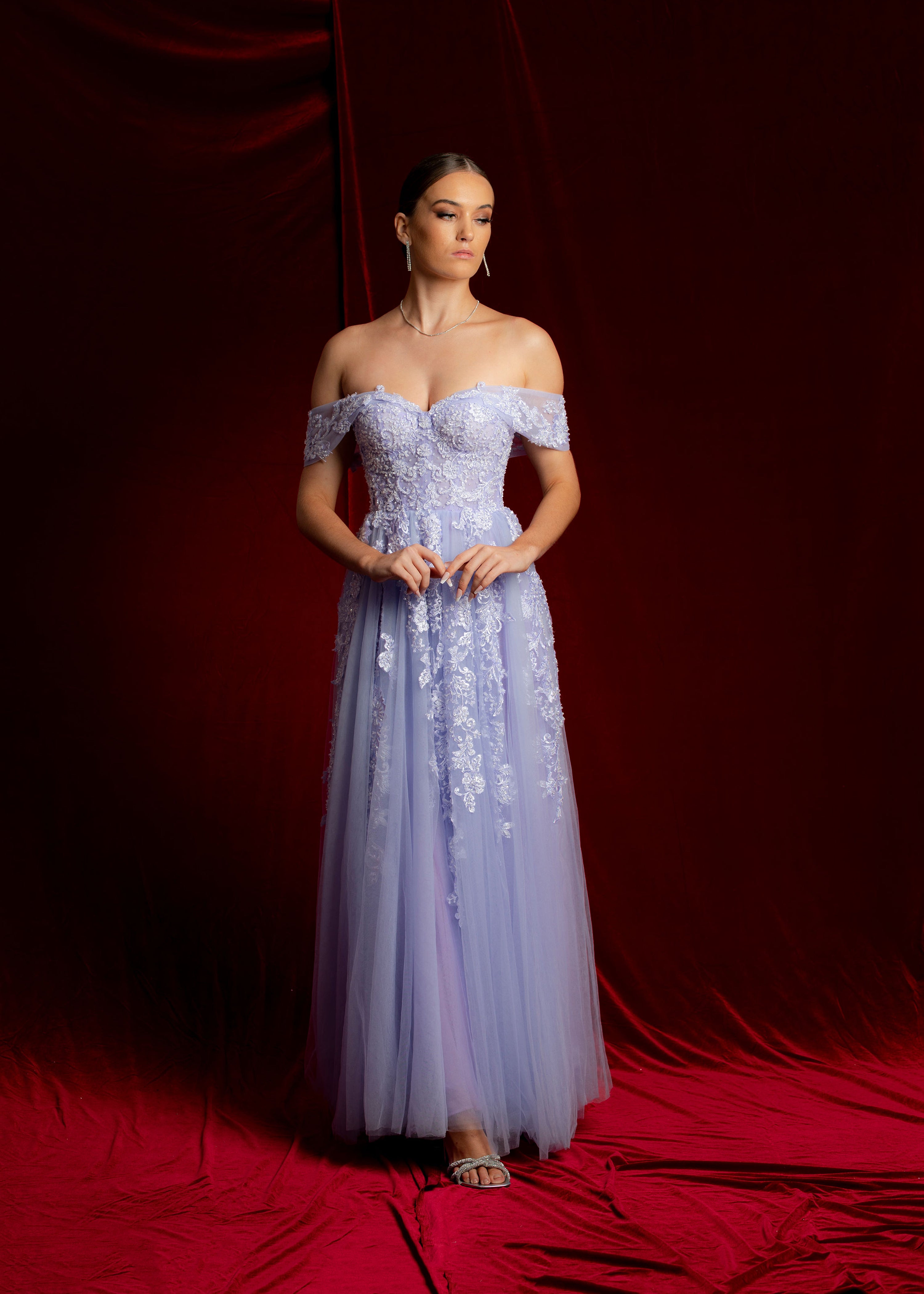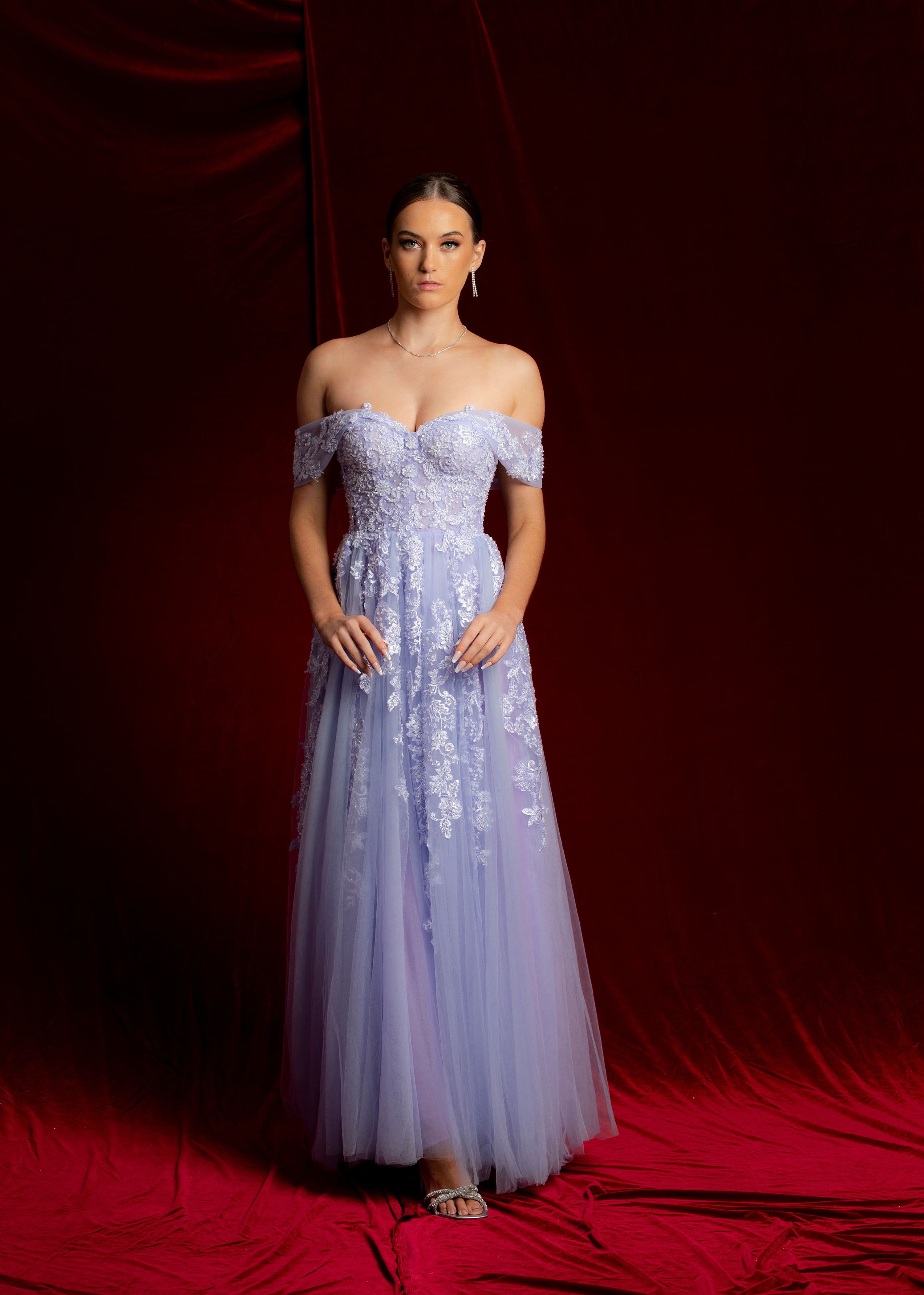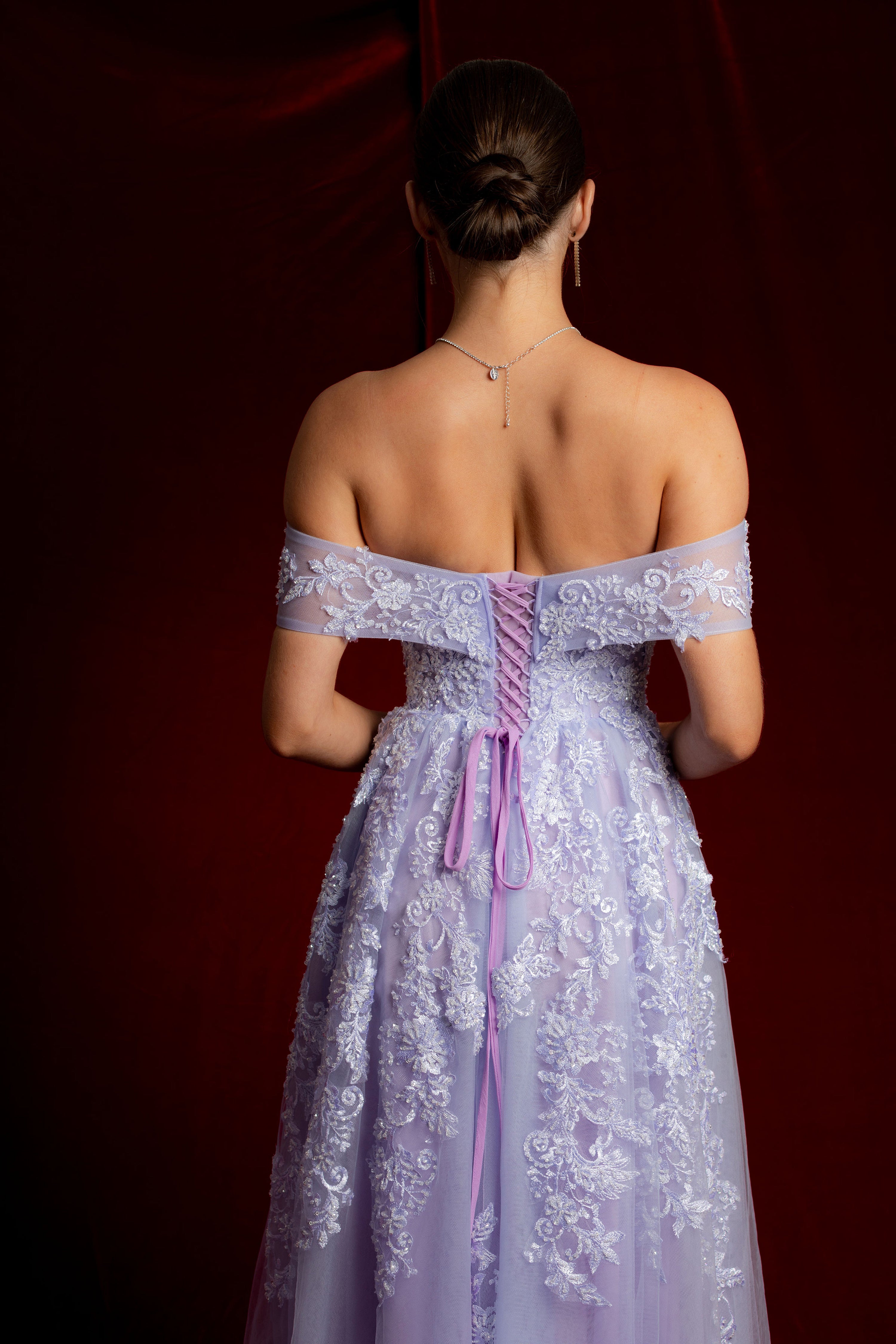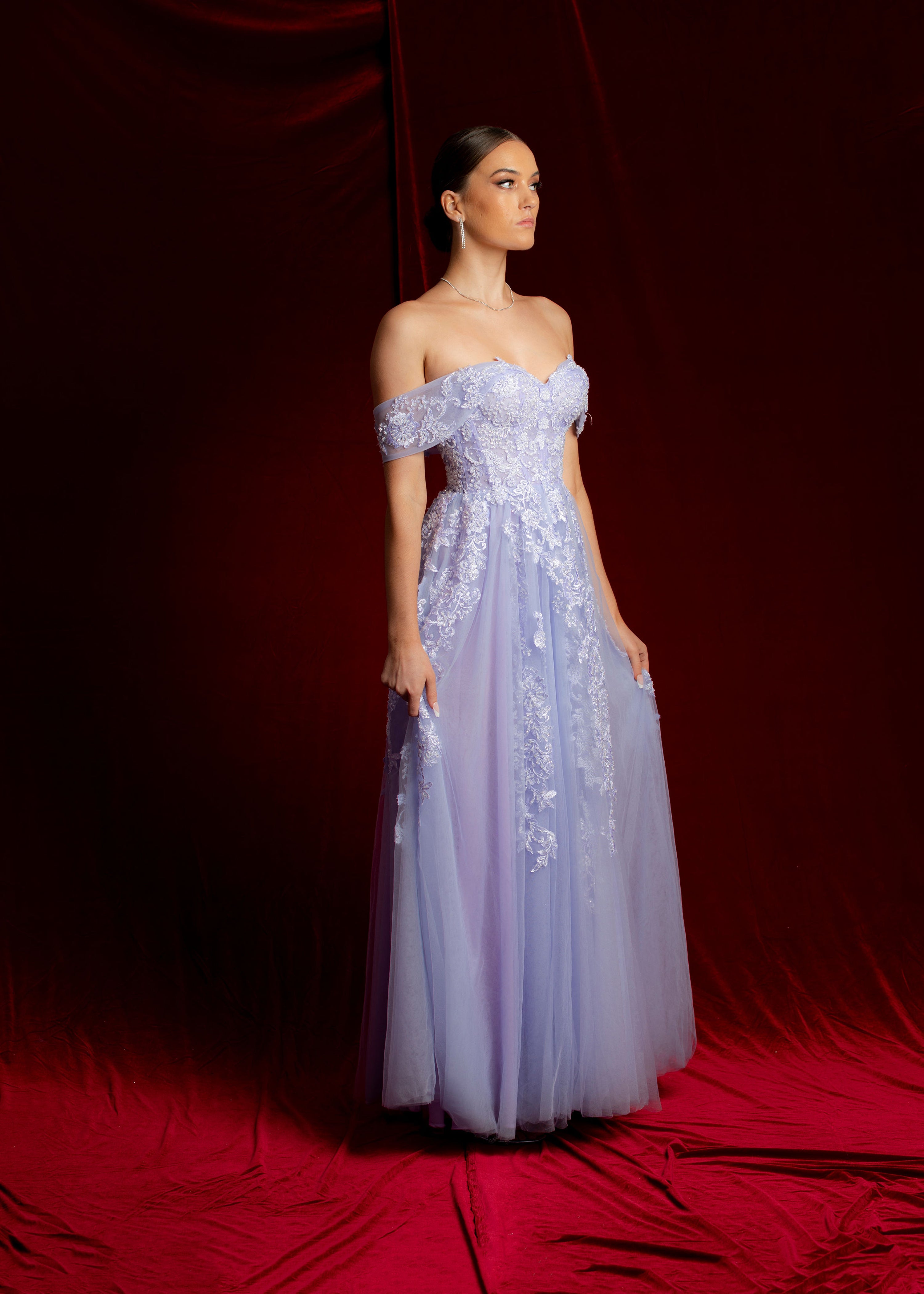 Elegance is elevated with **off-the-shoulder sleeves**, exuding timeless glamour and refined charm. The **bodice is adorned with hand-sewn crystals**, catching the light and adding a subtle, enchanting sparkle throughout the night.