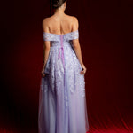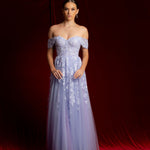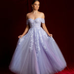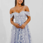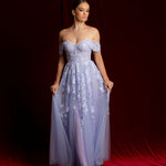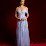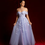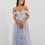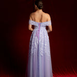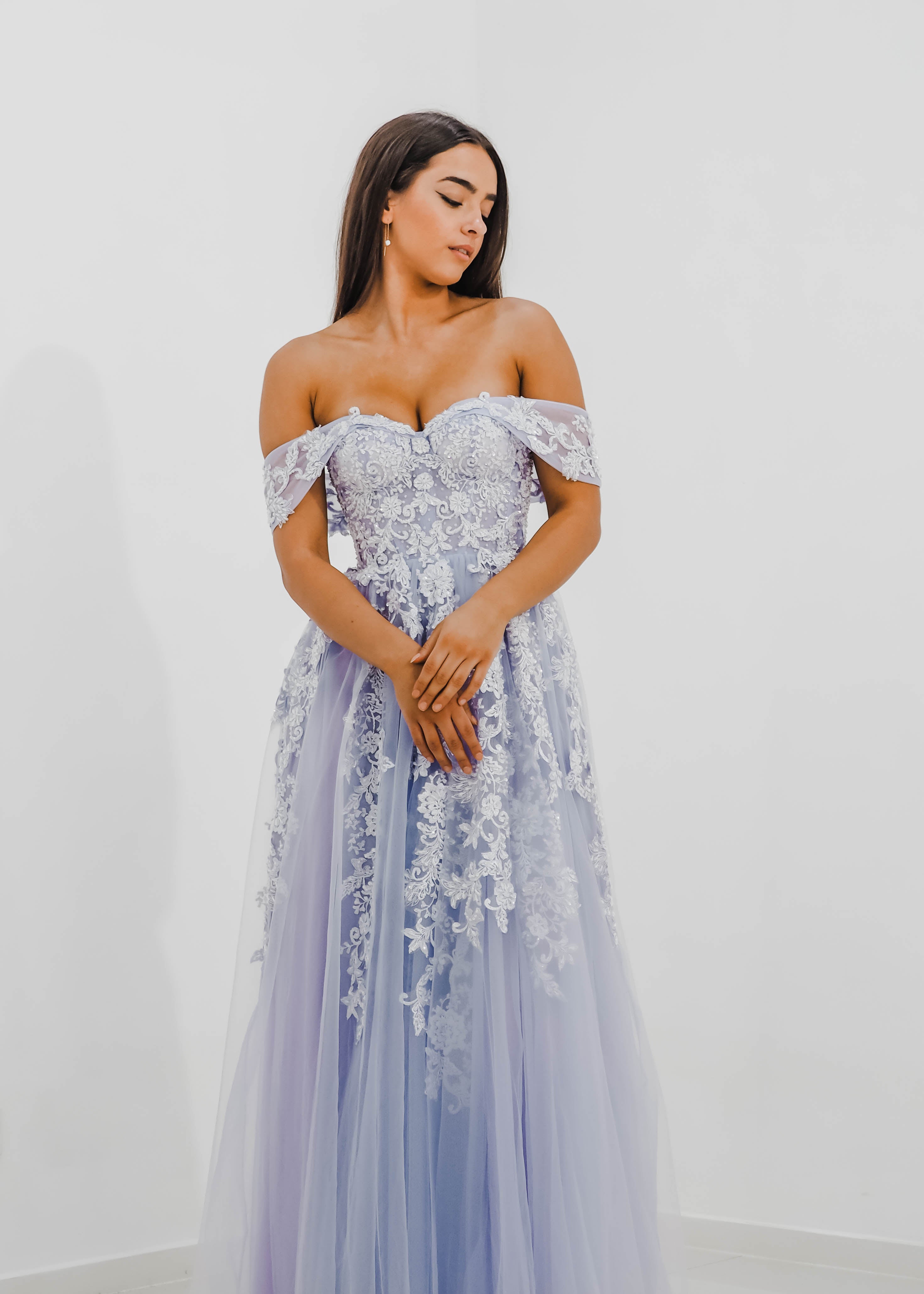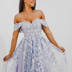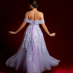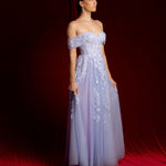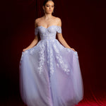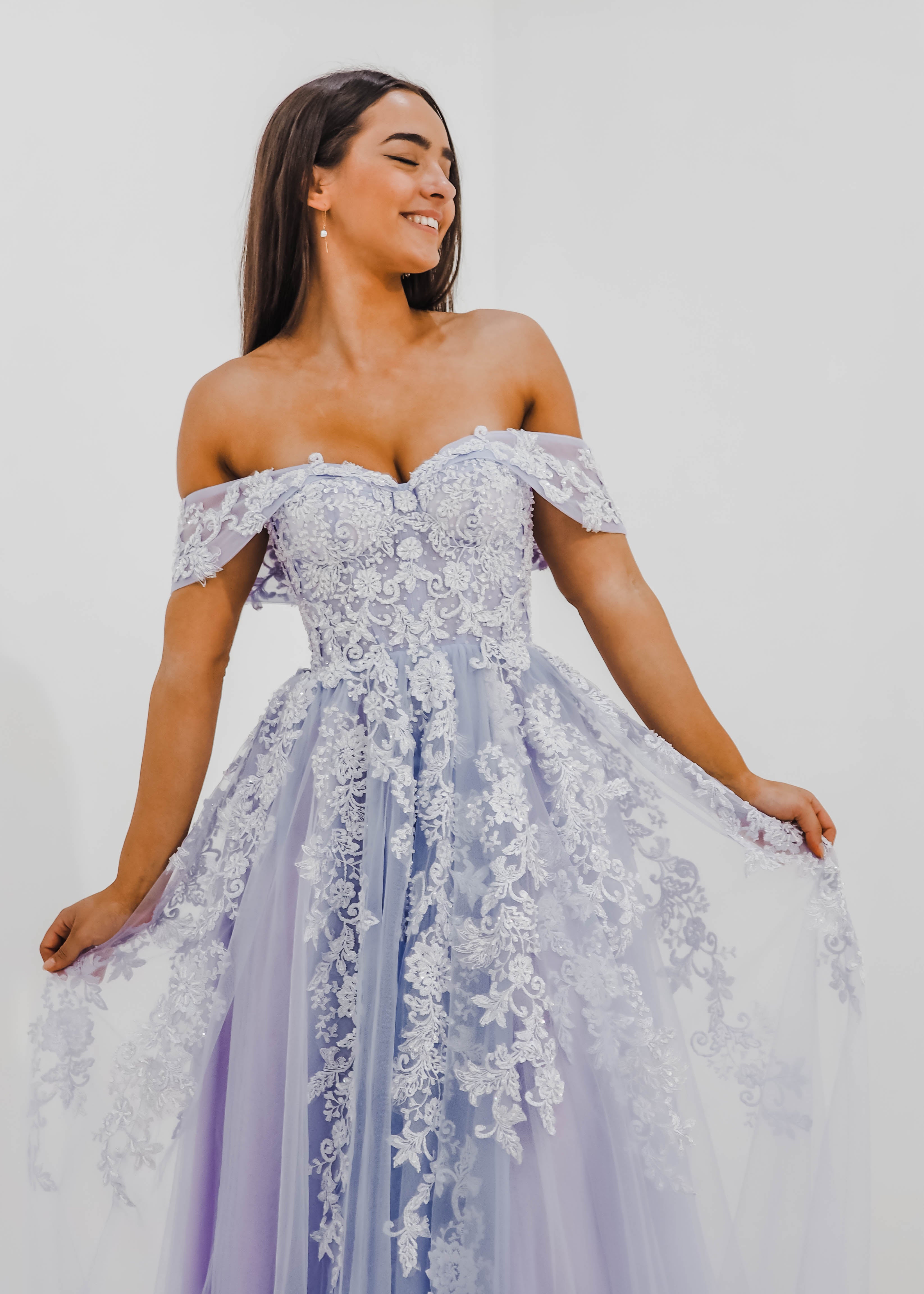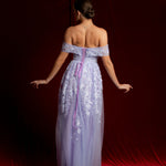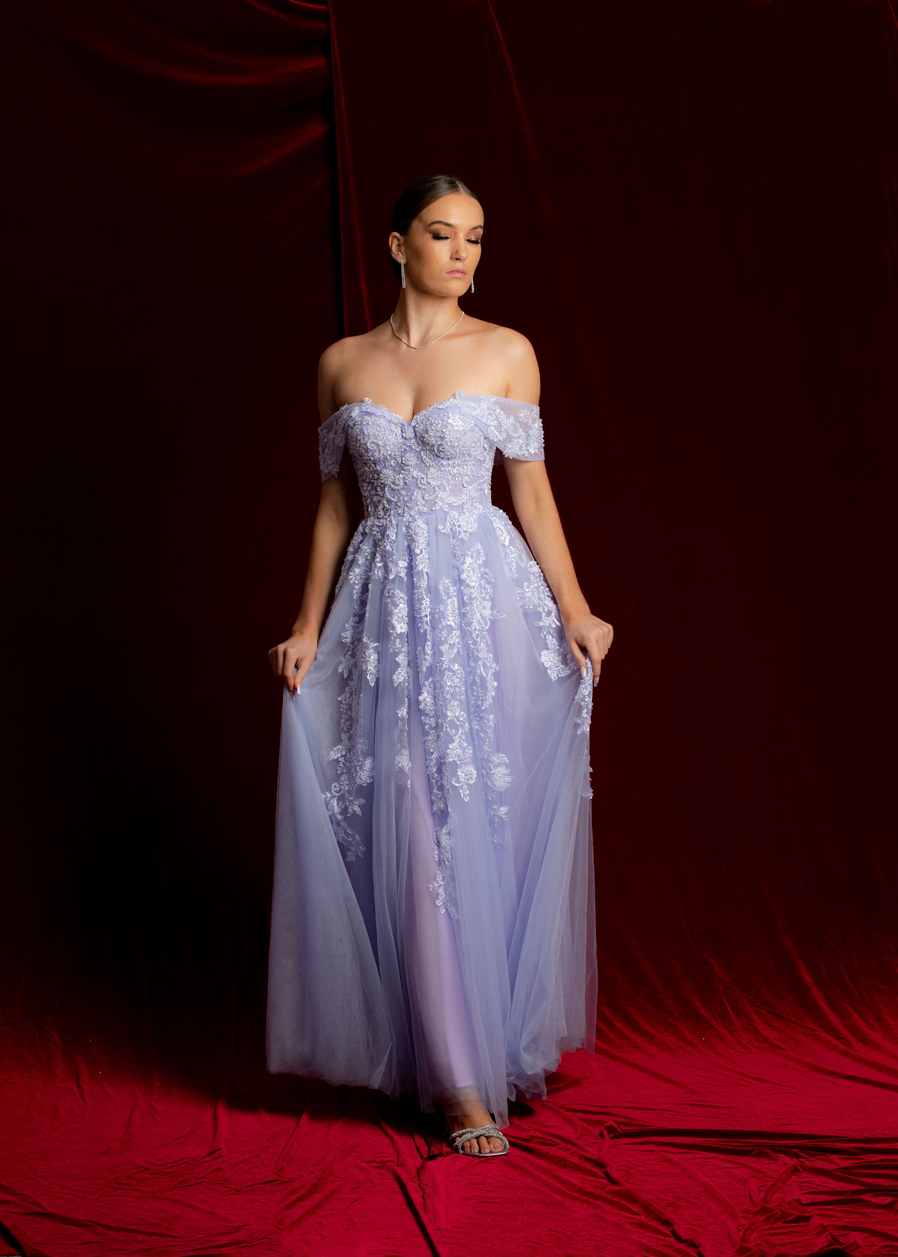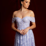 Elegance is elevated with **off-the-shoulder sleeves**, exuding timeless glamour and refined charm. The **bodice is adorned with hand-sewn crystals**, catching the light and adding a subtle, enchanting sparkle throughout the night.