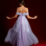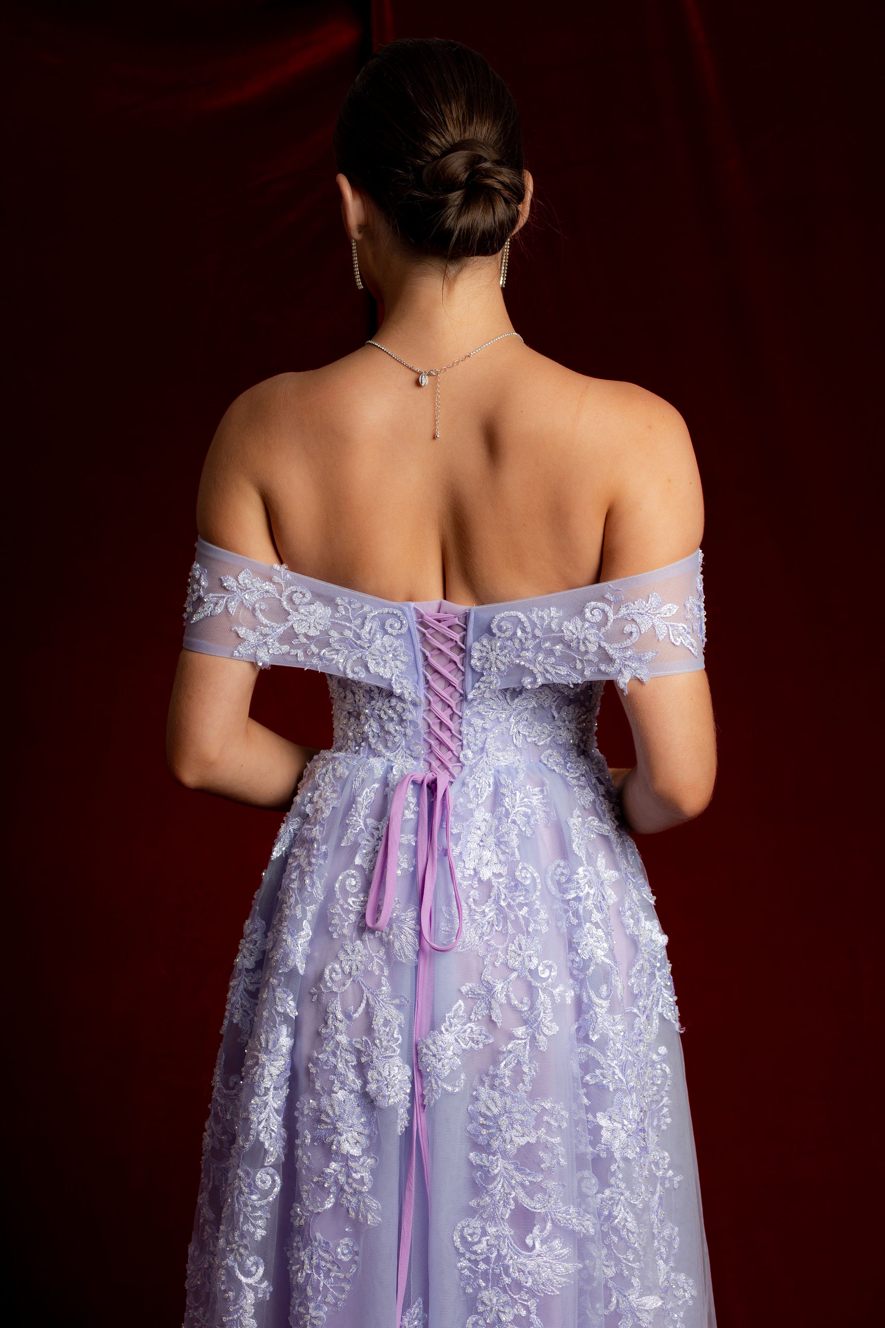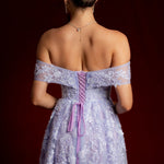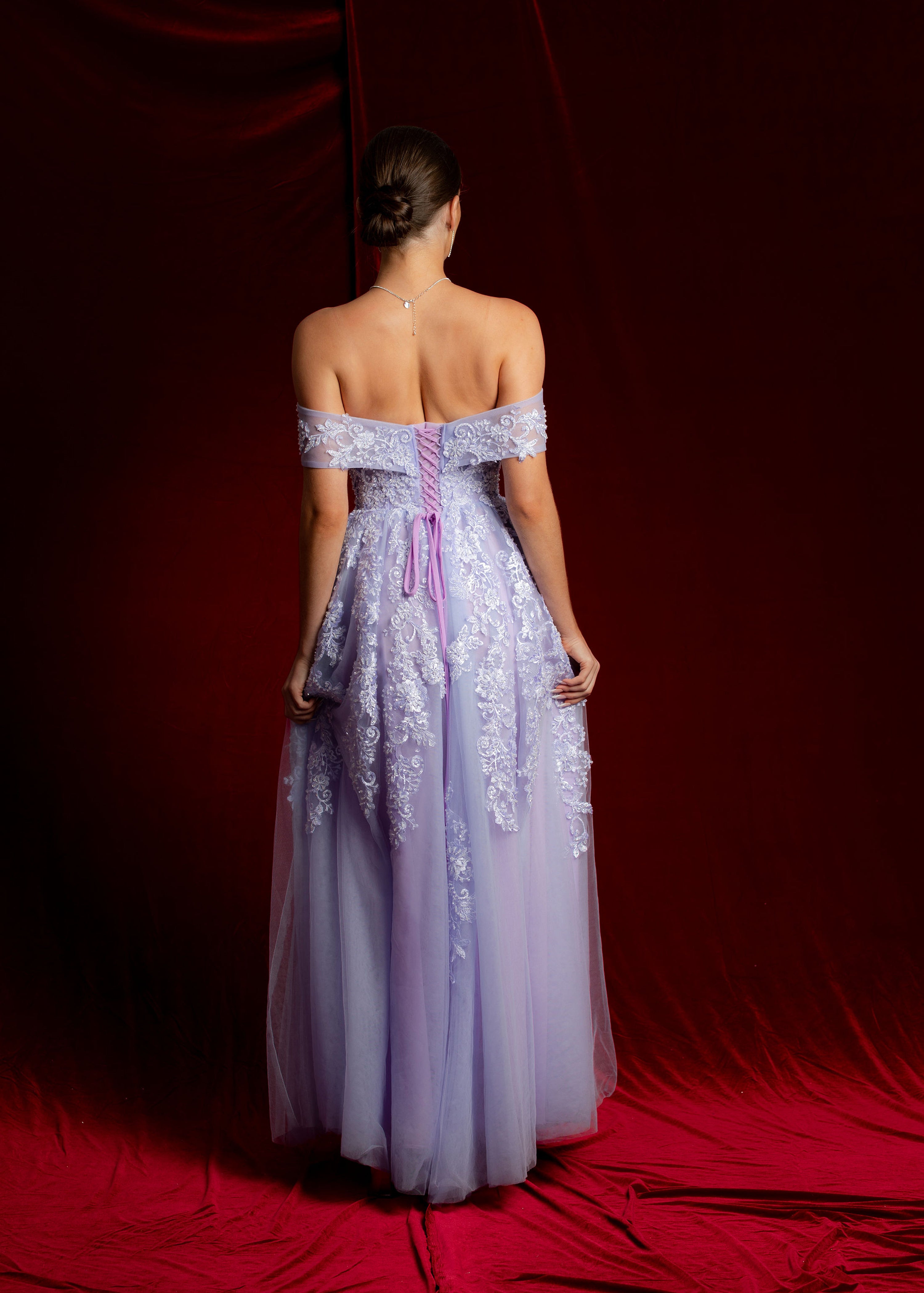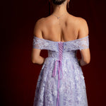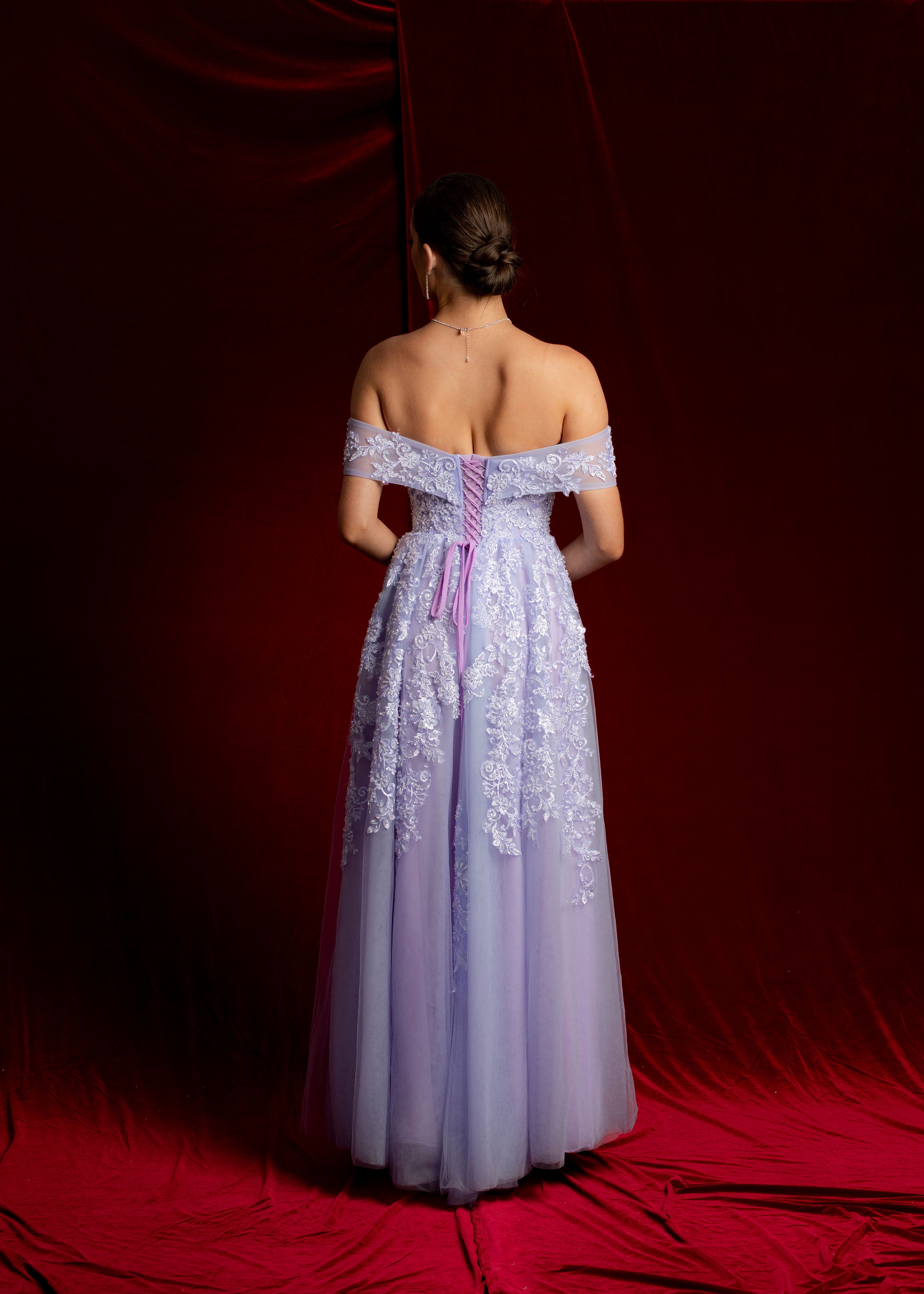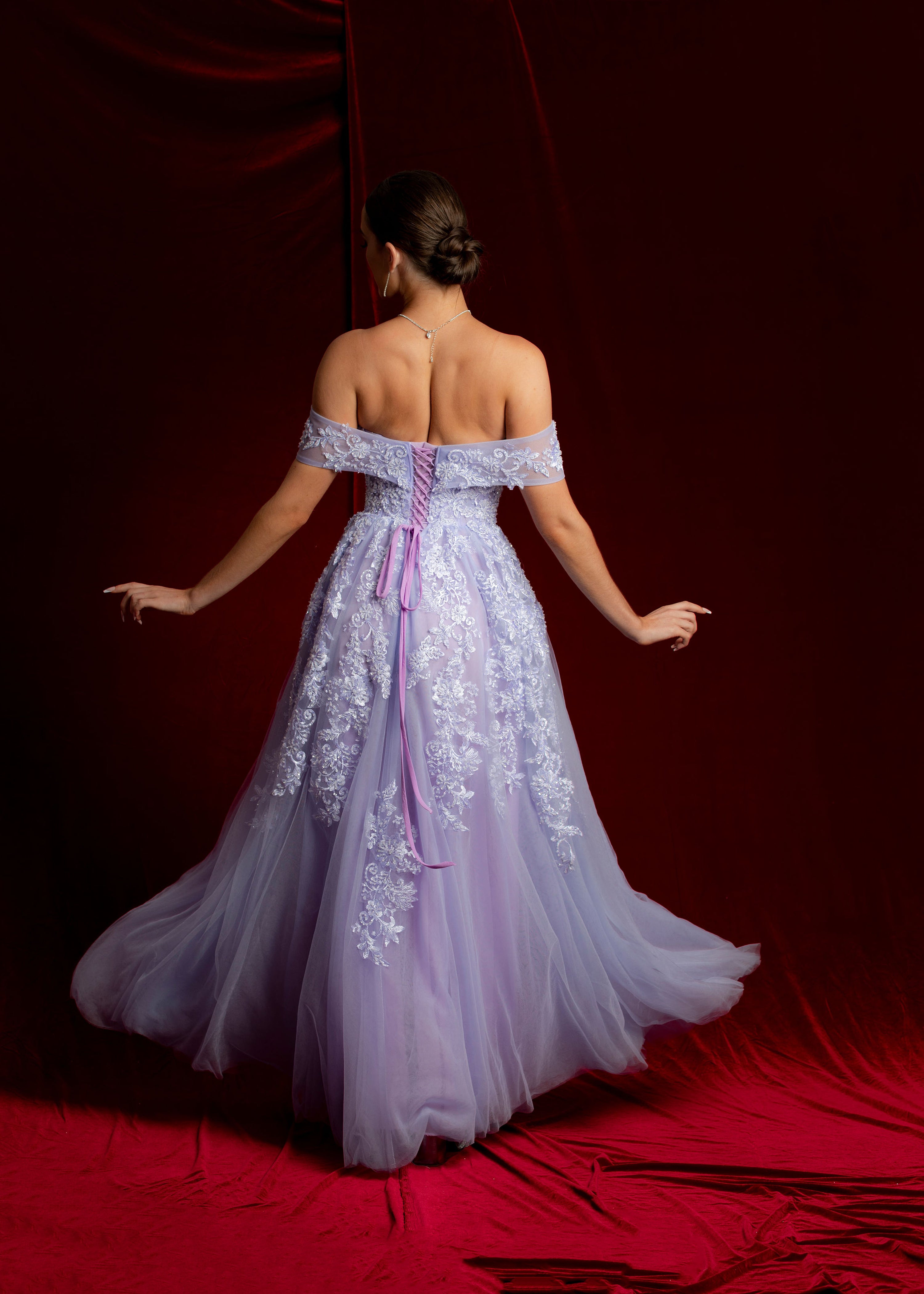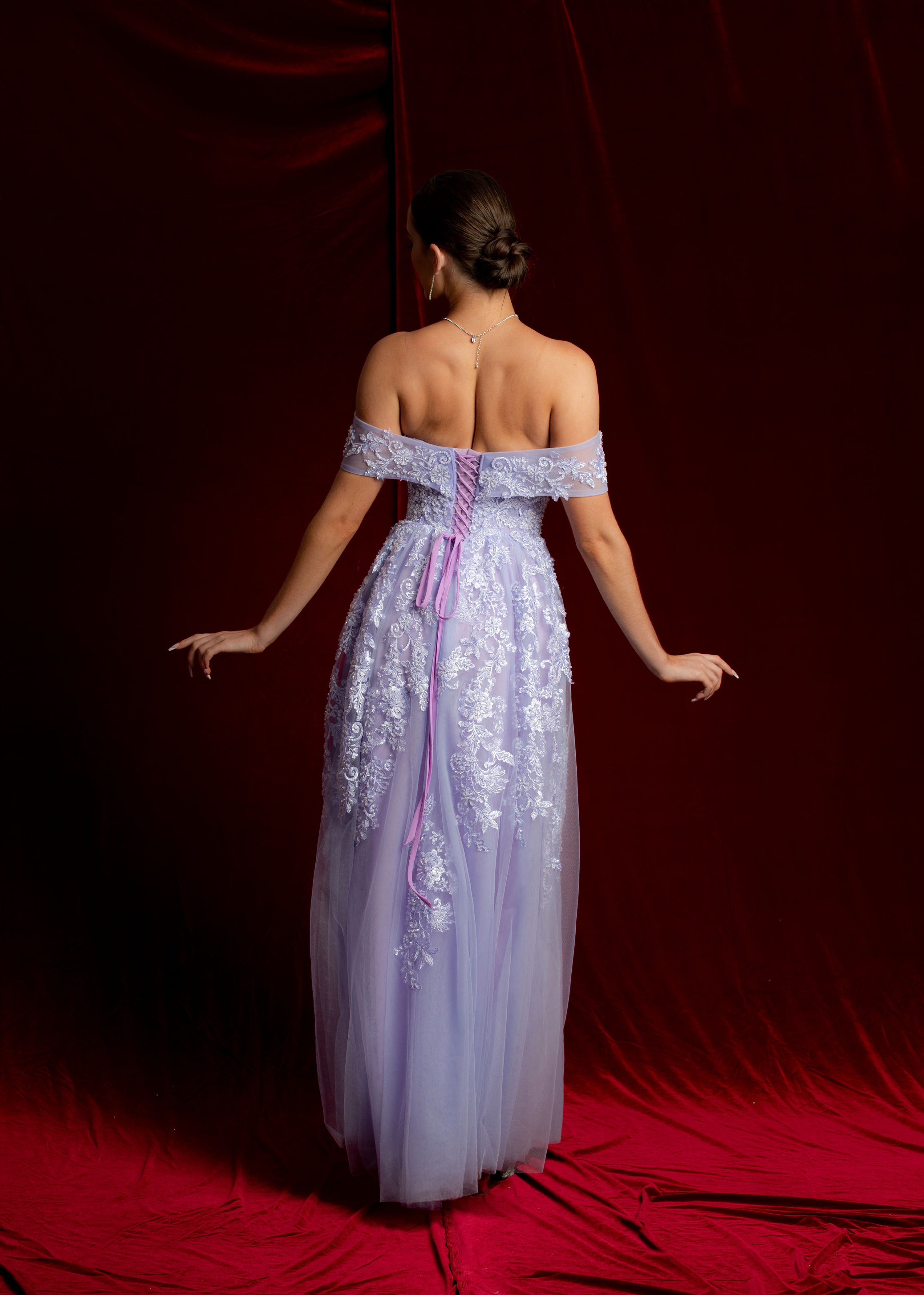 Made from **high-quality lilac tulle**, this gown features a **hand-sewn lilac floral lace bodice** that flows seamlessly into a **ribbed, structured corset**, expertly designed to cinch the waist and enhance your silhouette. The result? A stunning hourglass shape that turns heads with every step.