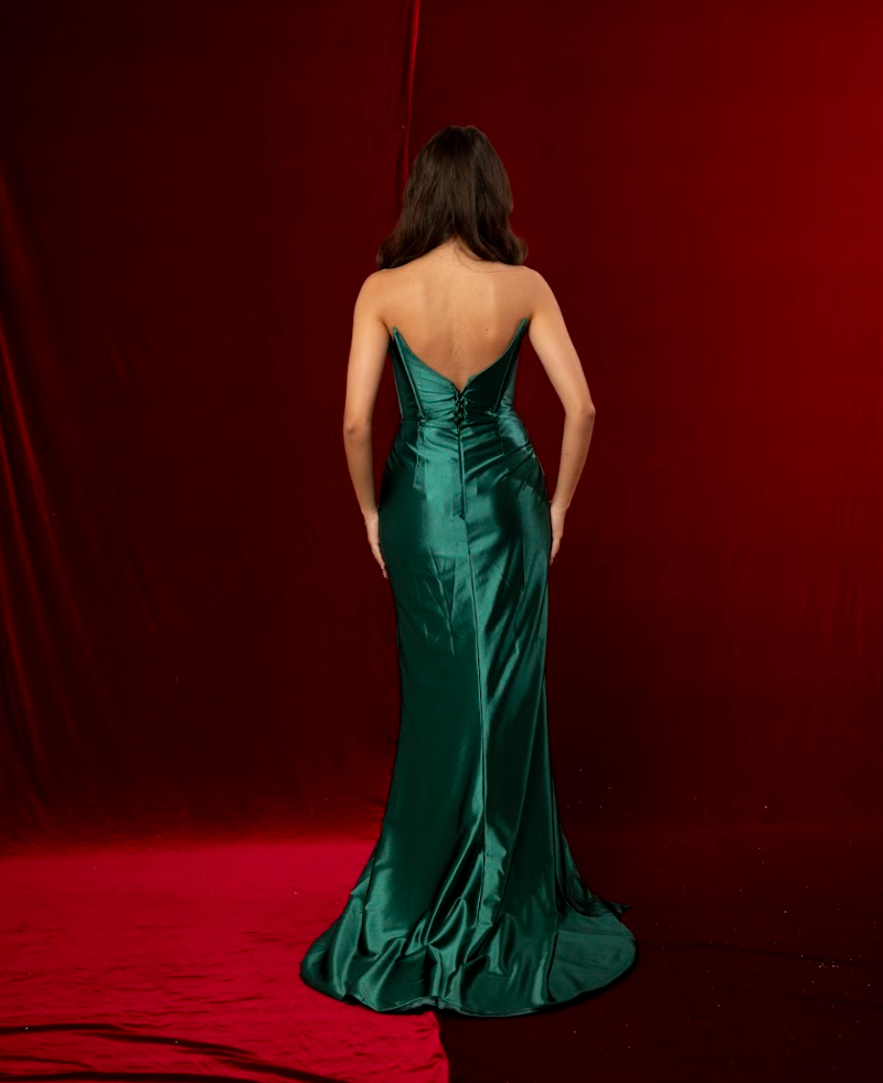 Introducing Yasmin turn up the drama with this striking green satin A-line dress, designed to make a statement. The off-the-shoulder neckline exudes elegance and allure, showcasing your shoulders and collarbone beautifully. The flattering A-line silhouette flows effortlessly, while the daring thigh-high slit adds a touch of sensuality and sophistication. Crafted from a stunning green satin, this dress shimmers with every movement, ensuring you stand out at any event.