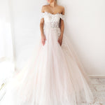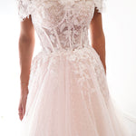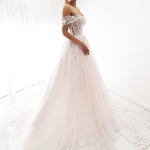 - High quality blush tulle dress with handmade floral lace hand sewn on to a ribbed structured corset look which makes anyone who wears it  have an extra small waist.