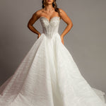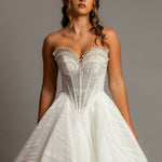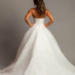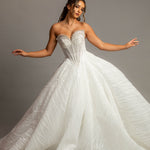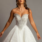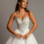 Presenting "Adela," a divine manifestation of fairy tale enchantment in bridal attire. Crafted with meticulous care, this ethereal gown features a strapless bodice adorned with intricate hand-beaded rhinestones and pearls, adding a touch of opulence and sophistication to your bridal ensemble.